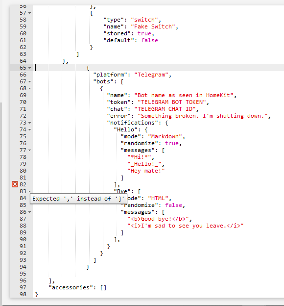 Alles anzeigen{ "bridge": { "name": "Homebridge", "username": "XXXXXXXXXXXX", "port": 51826, "pin": "XXXXXXXX" }, "description": "Home Smart Home", "platforms": [ { "platform": "config", "name": "Config", "port": 8080, "auth": "form", "theme": "red", "restart": "sudo -n systemctl restart homebridge", "temp": "/sys/class/thermal/thermal_zone0/temp", "sudo": true, "log": { "method": "systemd", "service": "homebridge" } }, { "platform": "Fritz!Box", "name": "XXXXX", "username": "XXXXX", "password": "XXXXX", "url": "http://192.168.178.1", "interval": 60, "hide": [ "wifi", "<ain>" ], "concurrent": false, "wifiName": "Guest WLAN", "options": { "strictSSL": false } }, { "platform": "Hue", "users": { "XXXXXXXXXX": "XXXXXXXXXX-XXXXXXXXXX" }, "lights": true }, { "platform": "AutomationSwitches", "switches": [ { "type": "automation", "name": "Automation Switch Flur", "period": 3, "autoOff": true }, { "type": "switch", "name": "Fake Switch", "stored": true, "default": false } ] }, { "platform": "Telegram", "bots": [ { "name": "Bot name as seen in HomeKit", "token": "TELEGRAM BOT TOKEN", "chat": "TELEGRAM CHAT ID", "error": "Something broken. I'm shutting down.", "notifications": { "Hello": { "mode": "Markdown", "randomize": true, "messages": [ "*Hi!*", "_Hello!_", "Hey mate!" ] ], "Bye": [ "mode": "HTML", "randomize": false, "messages": [ "<b>Good bye!</b>", "<i>I'm sad to see you leave.</i>" ] ] } } ] } ], "accessories": [] }Mal angenommen ich entferne das , was hier moniert wird, dann müsste auch ] davor weg. Das ich zwischen "Hey mate" und "Bye" also nur ein ], habe (statt wie jetzt zwei). Dann geht es aber wieter in der übernächsten Zeile, aus "mode": "HTML", will er "mode", "HTML", machen, weil er wohl durch die Syntax das nicht mehr "als Block interpretiert".