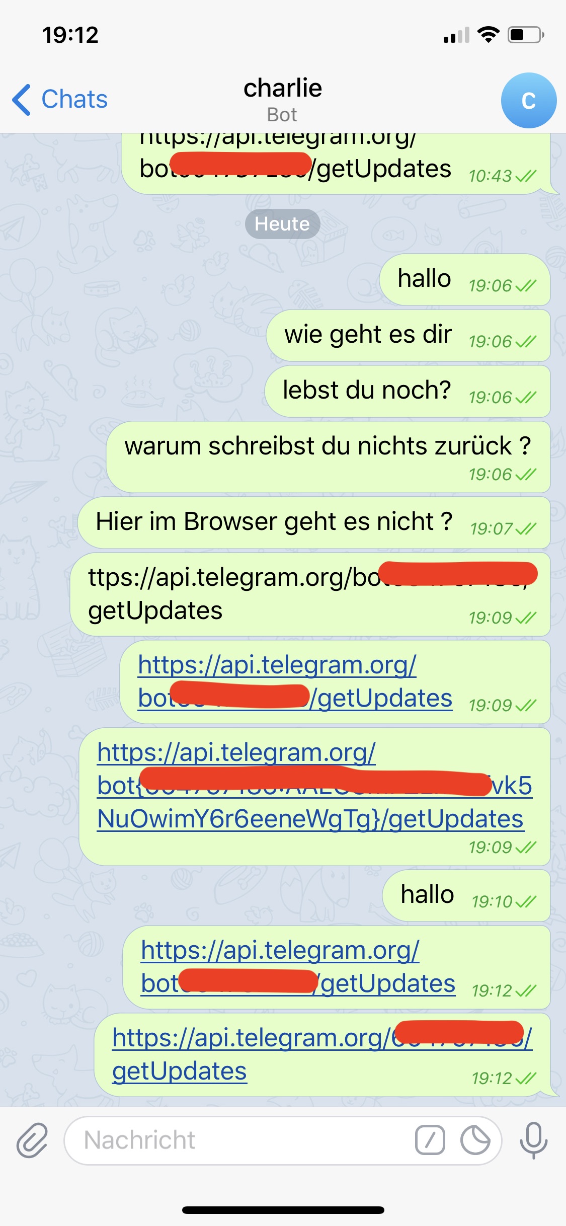 Schreib im Bot-Fenster mal etwas mehr als nur Hallo oder Test, wenn der Link im Browser noch nichts ausgibt.