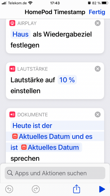 Ich habe meinen Briefkasten mit einem Tür- und Fensteröffner smart gemacht. Dazu habe ich mir auch eine Automation erstellt, dass ich eine Nachricht auf Telegram bekomme. Alles funktioniert. Jetzt würde ich es aber auch so haben wollen, dass mir mein HomePod, also Siri sagt, dass die Post da war. Aber ich weiß nicht wie ich es umsetzen kann. Also den HomePod sagen, dass er evtl nach ausgeführter Automation dann sagen soll: Die Post ist da!