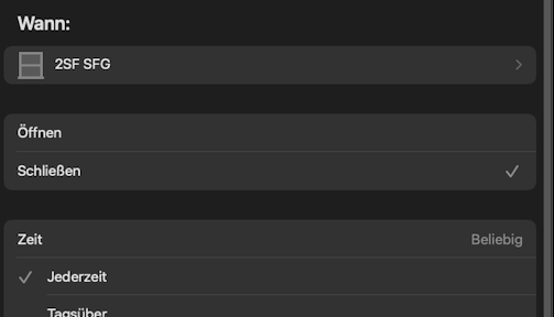 Zu Beispiel 2: Die Home-App kann entweder Sonnenauf- und Sonnenuntergang oder zu bestimmten Uhrzeiten. ein Mix aus Sonnenstand und Uhrzeit wie in dem Beispiel geht nicht. Das geht nur in anderen Apps wie der Controller App. Die Home App wird daraus aber immer "jederzeit" machen.