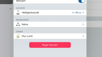 In diesem Beispiel will ich eine Lampe schalten wenn der LUX-Wert >= 36 ist - was aber nicht klappt. Es passiert gar nichts.