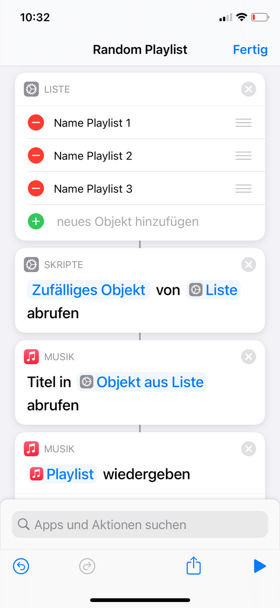 Ich würde gerne mit meinem HomePod Musik Automationen erstellen. Hierbei sollen aus einer Liste von mehreren Playlists, per Zufall eine eine ausgewählt und angespielt werden. D.h. z.B. Abends um 8 Uhr werden jeden Tag unterschiedliche Playlists ausgespielt. Leider habe ich bisher keine Möglichkeit dafür gefunden.