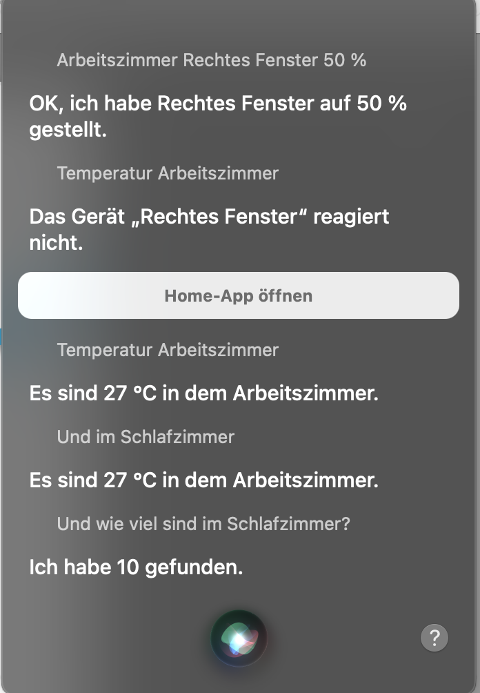 - Hey Siri, Fenster im Arbeitszimmer öffnen --> OK, die Fenster im Schlafzimmer sind geöffnet