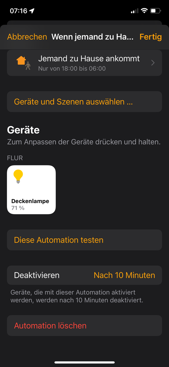 Wenn ich nach Hause komme, soll im Flur das Licht angehen und nach 10 Minuten wieder aus. Weiterhin soll der HomePod mit meinem Radiosender starten. Das kuriose ist nun das teilweise folgendes passiert: