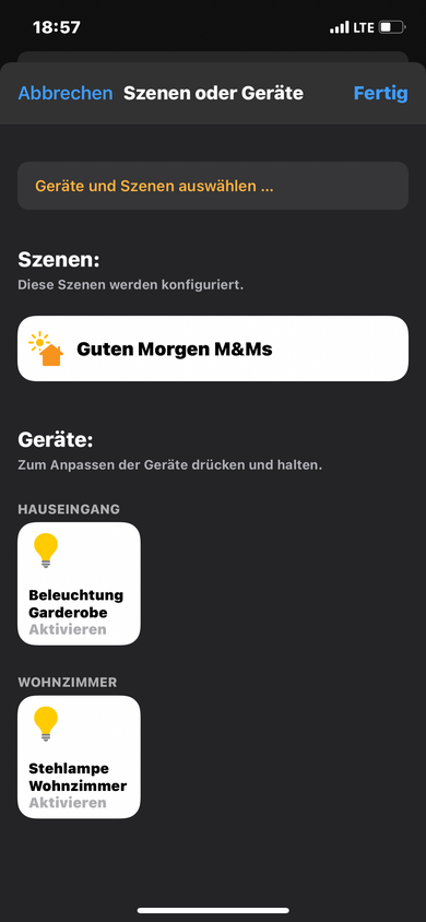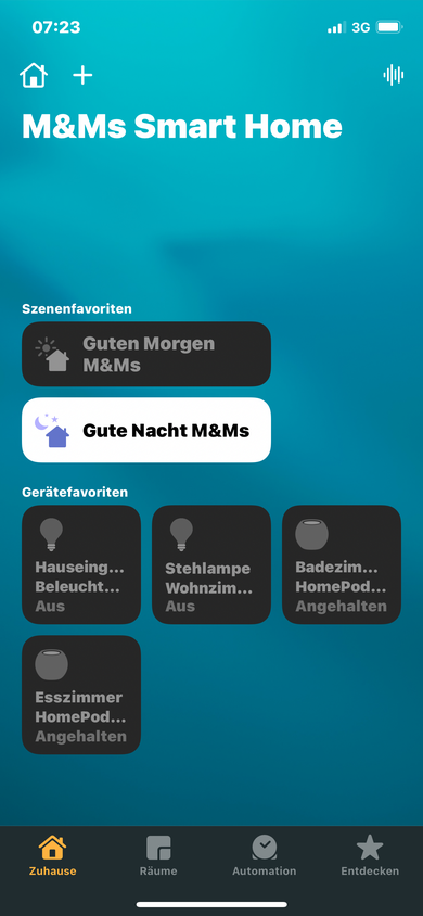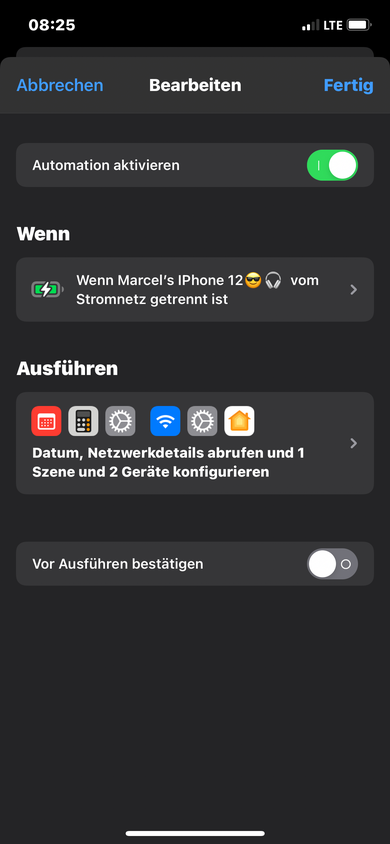 Damit wird unsere “Gute Nacht”-Szene, in der wir Lichter ausschalten, die Tür abschließen usw., automatisch aktiviert, sobald wir abends ins Bett gehen und das iPhone auf die Ladestation legen.