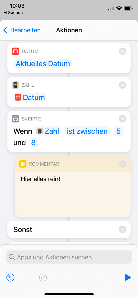 Mit der Aktion “Wenn” können wir dann prüfen, ob die Zahl zwischen 5 und 21 liegt.