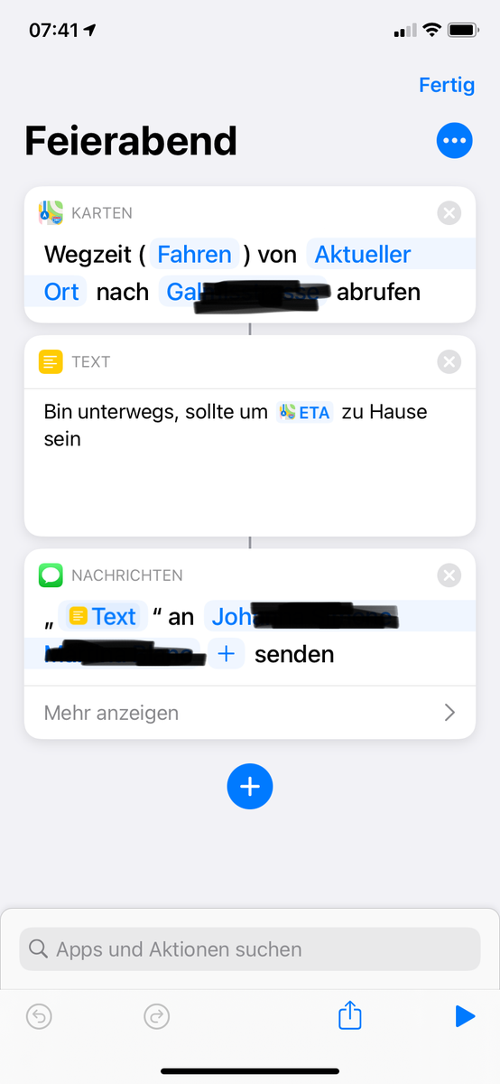 Ich habe einen Kurzbefehl, welcher automatisch eine Nachricht mit der geschätzten Ankunftszeit an meine Frau sendet, sobald ich das Büro verlasse.