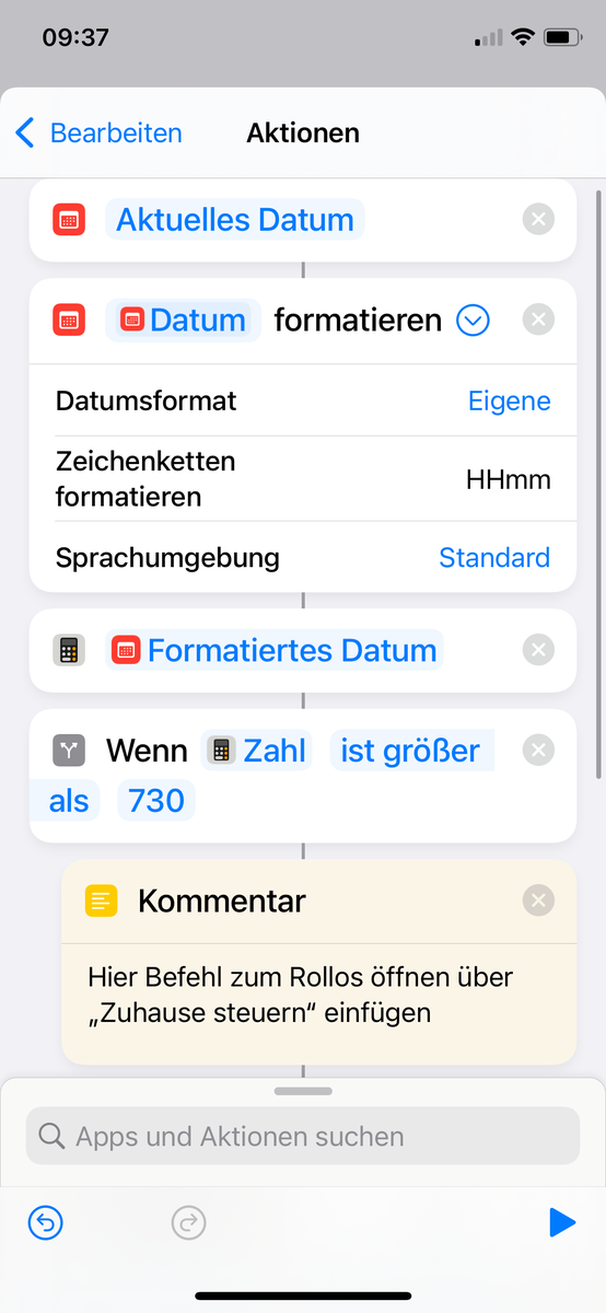 Ich habe es bislang versucht, indem ich in einem Kurzbefehl das Wetter (und damit die Sonnenaufgangszeit herunterlade und wollte dann eine Wenn-Abfrage erstellen im Sinne von „Wenn Sonnenaufgang nach 7:30 dann fahre zu Sonnenaufgang hoch, sonst fahre um 7:30 hoch“ aber das geht da anscheinend nicht.