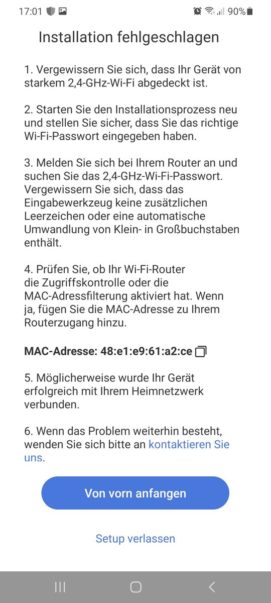 Ich habe schon versucht, dass 5 Ghz-Netz abzuschalten und die Installation nur über das 2,4 Ghz-Netz laufen zu lassen, ohne Erfolg. Ich habe die Steckdose auch an einer anderen Stelle in der Wohnung eingesteckt, auch ohne Erfolg. Reset habe ich auch schon durchgeführt.