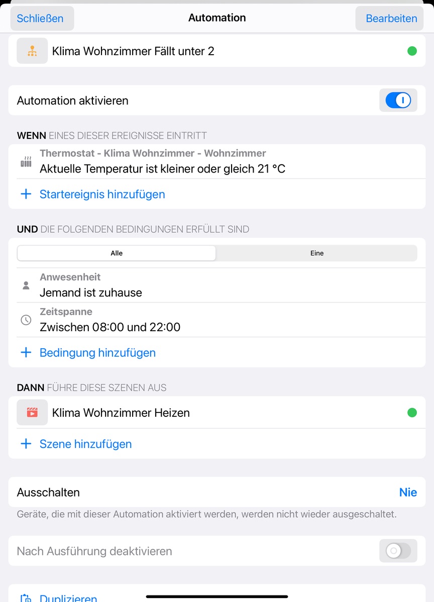 Ich habe eine Automation erstellt, welche die Heizung einschalten soll, unter den Bedungungen dass Temperatur unter 20°, zwischen 8 und 22 Uhr, sowie wenn jemand zu Hause ist, erstellt.