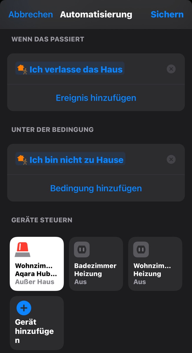 2. Die Heizautomation funktioniert jetzt richtig gut, danke nochmal dafür. Das einzige Problem ist nur - obwohl ich als Bedingung für „Heizung ein“ ich bin Zuhause eingestellt habe, wird die Heizung bei Verlassen des Hauses nicht automatisch ausgeschaltet, sondern heizt weiter, was ja an sich Unsinn ist. Muss ich da als Auslöser bei Heizung aus noch zusätzlich „ich verlasse das Haus“ angeben? Und ist das in der selben Automation möglich oder sollte ich dazu eine neue erstellen?