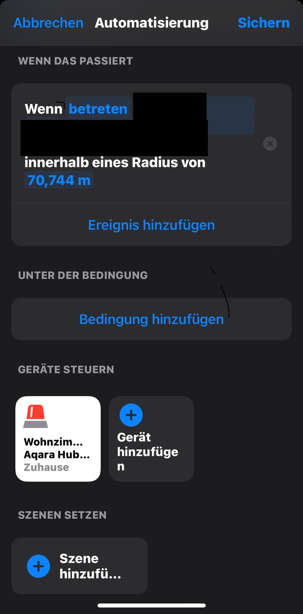 Ich sehe gerade, dass in dem Auslöser betrete Adresse X sogar ein Radius separat ausgewiesen ist. Kenne ich so nicht in dem Detail (nutze aktuell Home+ aber auch nicht). Müsstest du einfach mal testen, ob das so klappt. Der Modus „Zuhause“ für den Aqara Hub sollte auch ohne Bestätigung funktionieren denke ich.