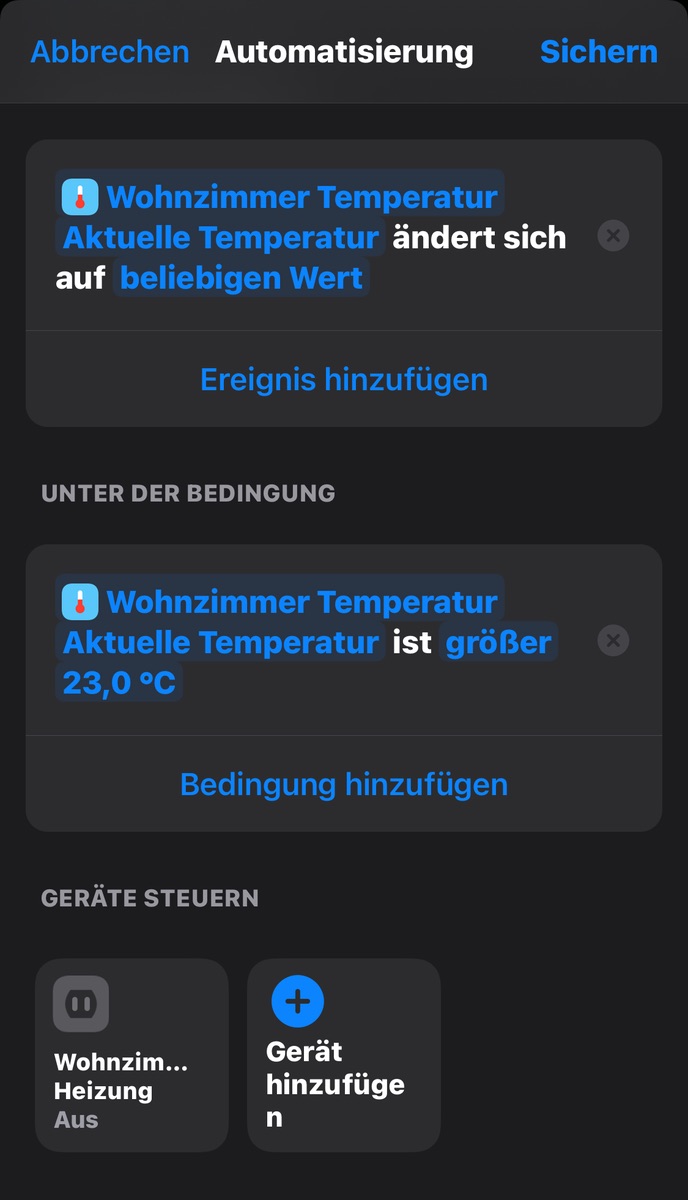 In meiner Wohnung gibt es nur eine Stromheizung im Wohnzimmer und Badezimmer. Daher wollte ich mittels Sensoren und den smarten Steckdosen eine konstante Temepratur mittels Automation regulieren. Leider gelingt mir das mit der Eve App im Moment noch nicht wirklich, teilweise springt die Automation zwar an, aber heizt dann bis ins Unermessliche. Als Zwischenapp benutze ich die Eve App. Die Automation ist so geschrieben, dass wenn der Status des Hubs Zuhause ist und die Zimmertemperatur unter 21* fällt, die Heizung über die Steckdose eingeschaltet werden soll. Leider springt diese Automation nicht immer an und wenn stoppt sie nicht mehr ab den 21*. Außerdem bin ich mir nicht sicher, ob ich die Automation richtig geschrieben habe bzw. Wie ich das Problem beheben kann, sodass immer eine konstante Temperatur herrscht. Ist dafür evtl. eine bessere App nötig?