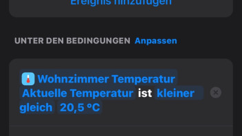 In meiner Wohnung gibt es nur eine Stromheizung im Wohnzimmer und Badezimmer. Daher wollte ich mittels Sensoren und den smarten Steckdosen eine konstante Temepratur mittels Automation regulieren. Leider gelingt mir das mit der Eve App im Moment noch nicht wirklich, teilweise springt die Automation zwar an, aber heizt dann bis ins Unermessliche. Als Zwischenapp benutze ich die Eve App. Die Automation ist so geschrieben, dass wenn der Status des Hubs Zuhause ist und die Zimmertemperatur unter 21* fällt, die Heizung über die Steckdose eingeschaltet werden soll. Leider springt diese Automation nicht immer an und wenn stoppt sie nicht mehr ab den 21*. Außerdem bin ich mir nicht sicher, ob ich die Automation richtig geschrieben habe bzw. Wie ich das Problem beheben kann, sodass immer eine konstante Temperatur herrscht. Ist dafür evtl. eine bessere App nötig?