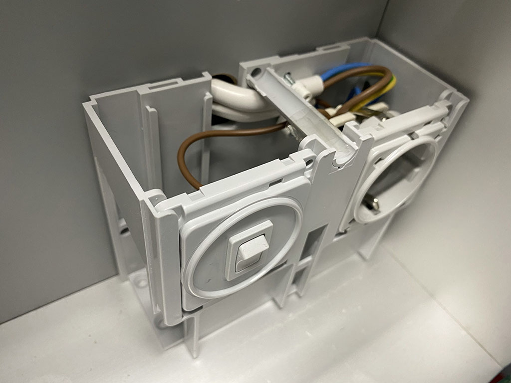 Ich habe jetzt das Schaltmodul eines Eve-LightSwitch eingebaut. Da in dem Kästchen im Schrank ja auch eine Steckdose ist, gibt es dort ja auch einen Null-Leiter.