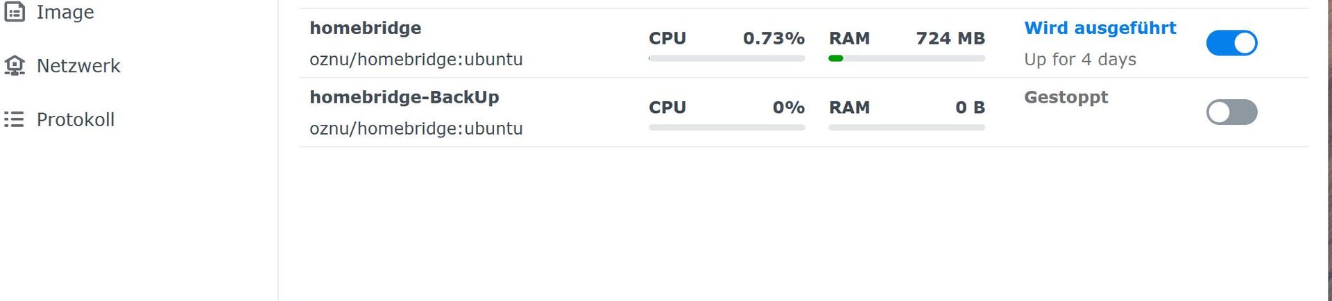 Homebridge läuft bei mir im Docker auf einem Synology NAS.