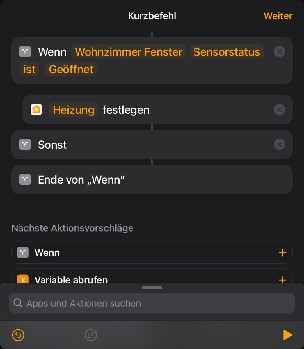 Außerdem, dass die Heizungen eingeschaltet werden (ohne konkrete Temperaturvorgabe), sobald das Fenster geschlossen wird. Auch das funktioniert bis dahin ohne Probleme.