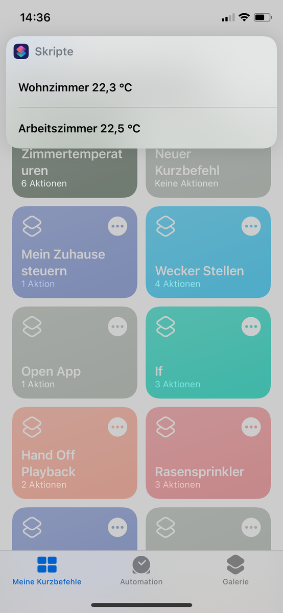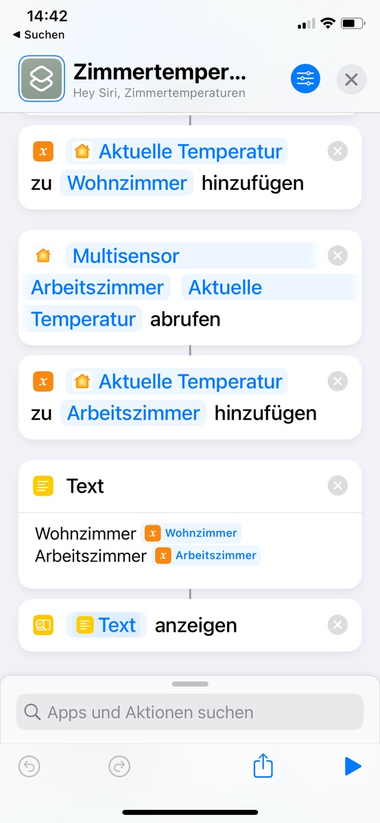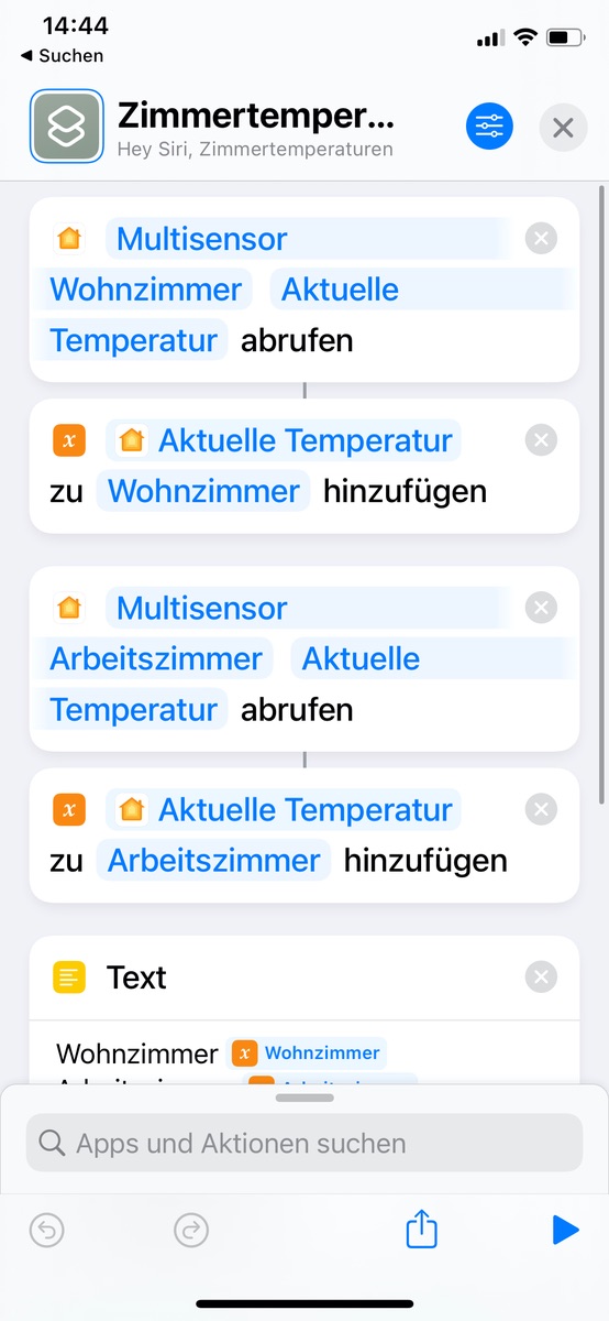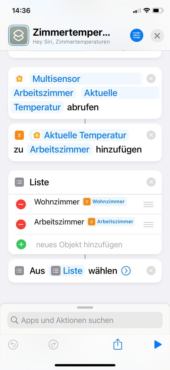 Hallo zusammen. Bin neu bei den Kurzbefehlen und auch neu hier. Mein Anliegen ist es, mit Click auf den Kurzbefehl alle abrufbaren Temperaturen (Thermostate, Bewegungsmelder) gelistet mit jeweiligem Raum zu bekommen. Bekomme es nicht gesammelt hin, immer nur einzelne Räume.