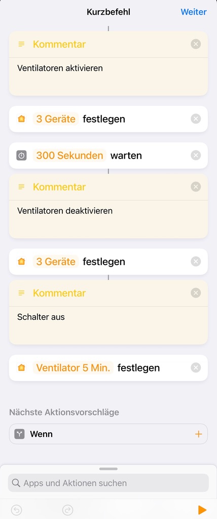 Suche eine Lösung, es gibt da sicherlich mehrere Ansätze, für einen Button / Szene bei der, wenn einmal gedrückt, meine 3 Ventilatoren für 5 Minuten laufen und dann wieder aus gehen. Dachte wäre ja schnell einzurichten, scheitere aber. Sehe ev. den Wald vor lauter Bäumen nicht.
