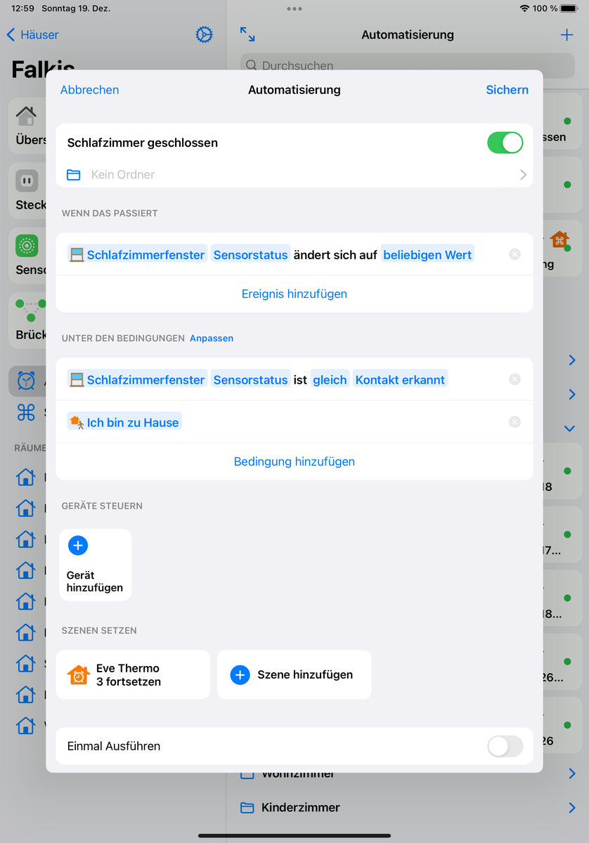 Aktuelles Szenario ist, dass der Fenstersensor die Heizung steuert. Geht das Fenster auf, geht die Heizung aus.