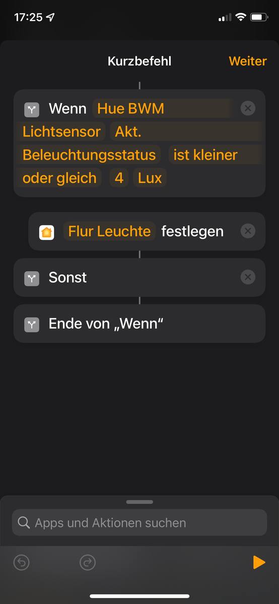 Unter anderem habe ich im Arbeitszimmer 3 Hue Lampen und den Hue Motion Sensor - und hab so meine Probleme damit. Ich möchte eine Automation erstellen dass sobald zwischen 13:00 und 20:00 Home Bewegung erkannt wird und die aktuelle Beleuchtungsstärke unter 5 Lux liegt die drei Lampen für 10 Minuten aktiviert werden. Den Hue Sensor habe ich natürlich in der Hue App zu HomeKit hinzugefügt bzw. gesagt dass er über HomeKit verwaltet wird.