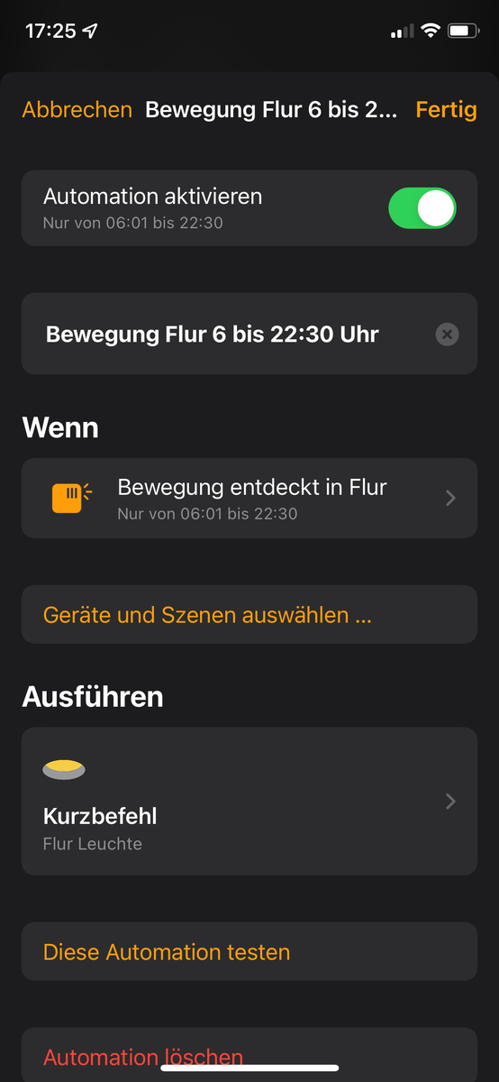 Wenn ich eine Szene für die Aktivierung der drei Lampen erstelle und dann eine Automation bei Detektion einer Bewegung zwischen 13:00 und 20:00 bzw. dem Unterschreiten von 5 Lux bekomme ich zwar eine Meldung von System dass Bewegung erkannt wurde, aber es bleibt dunkel (und der Raum hat definitiv unter 5 Lux, da der Sensor 3 Lux anzeigt bzw. bin ich in dem Zeitfenster).