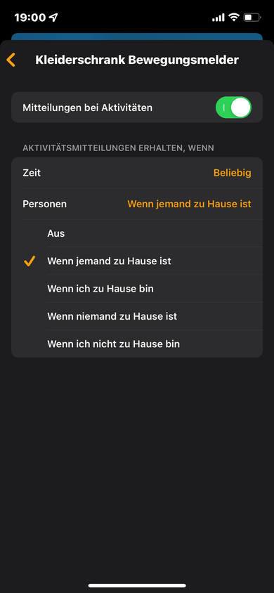 Wir haben eine Eve Motion auf dem Balkon als Katzenklingel im Einsatz. Das funktioniert auch gut. Wir sind zu zweit und haben zwei iPhones. Während mein Mann im Homeoffice arbeitet bin ich im Büro. Jetzt würden wir gern die Mitteilungen so einstellen, dass nur der die Mitteilungen bekommt, der zu Hause ist.