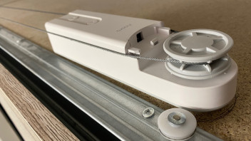 • Aqara Roller Shade Driver E1 auf dem Kleiderschrank befestigt. Den Seilzug ums Rad gehängt.