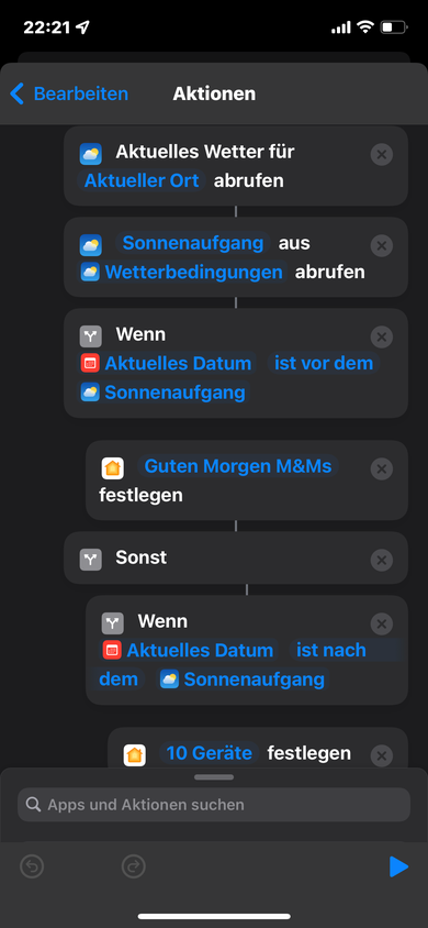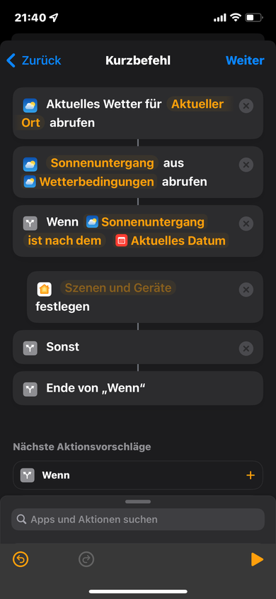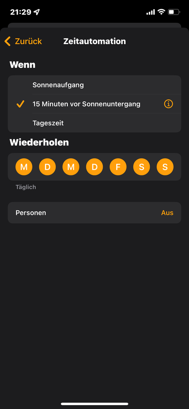 Irgendwo habe ich doch ein Gedanken Fehler? Ich möchte um 21:00 Uhr wissen ob es heute am 01.01.22 schon nach Sonnenuntergang ist. Wenn ja, schalte das Licht an. Aber die Homeapp gibt mir den Sonnenuntergang für den nächsten Tag schon an?????? Könnt ihr mir helfen? Wie muss man das Programmieren 😩😩😩😩