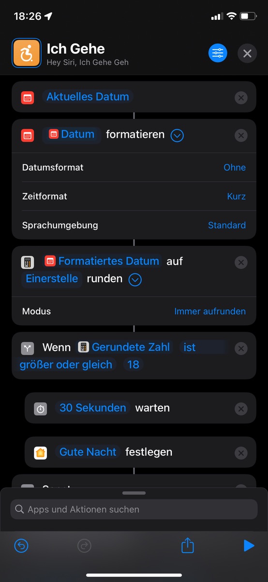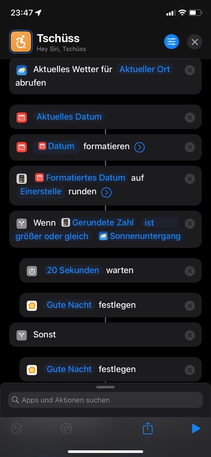 Ich habe vor, wenn ich das Haus verlasse, meinem HomePod "ich gehe" zu zurufen, und sollte es 45 Minuten nach Sonnenuntergang sein, wird diese Szene circa 30 Sekunden später auch ausgelöst. Ich habe im Eingangsbereich einen Bewegungsmelder welcher das Flurlicht einschaltet. Wenn ich diese Szene allerdings sofort aktiviere reagiert der Bewegungsmelder und schalte das Flurlicht wieder ein. Um dem entgegen zu wirken möchte ich das ganze zeitverzögert tun. Funktioniert das nur mit "Kurzbefehle" oder geht das auch über die HomeKit App? Gibt es vielleicht auch einen speziellen Workaround dafür? Ich bin gespannt auf eure Ideen und bin für eure Hilfe dankbar.