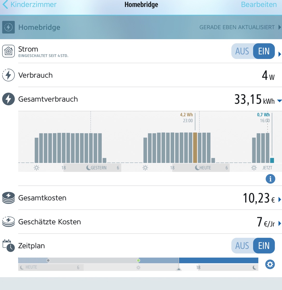 Merkwürdigerweise wird bei den Steckdosen, die den Verbrauch anzeigen, da übrigens „nein“ angezeigt.
