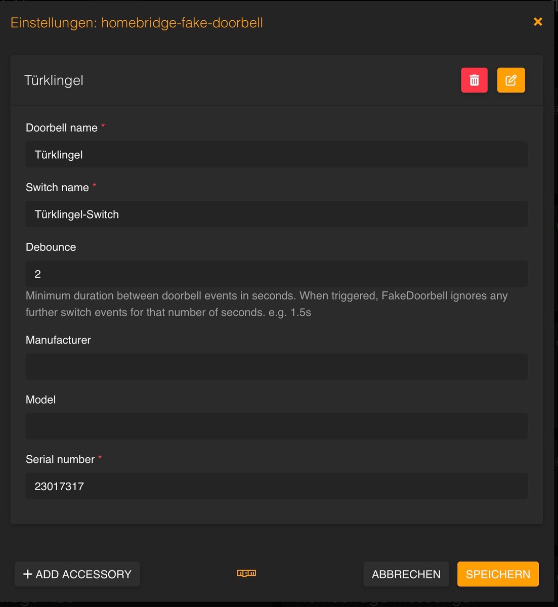 Nach langer Suche nach einer praktikablen und delay-freien Türklingel-Automation für Homekit bin ich auf den Fake Door Bell Switch für Homebridge gekommen.