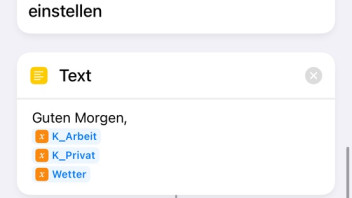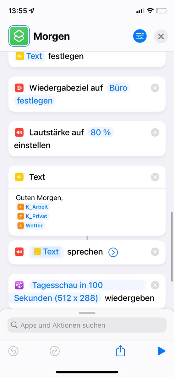 Diese Besteht in der "Kurzbefehle" App wie folgt: Ich rufe gewisse Ereignisse aus Kalendern und das Wetter ab und lasse Siri das sprechen. Danach soll der Podcast 100Sekunden Tagesschau auf dem HomePod gespielt werden.