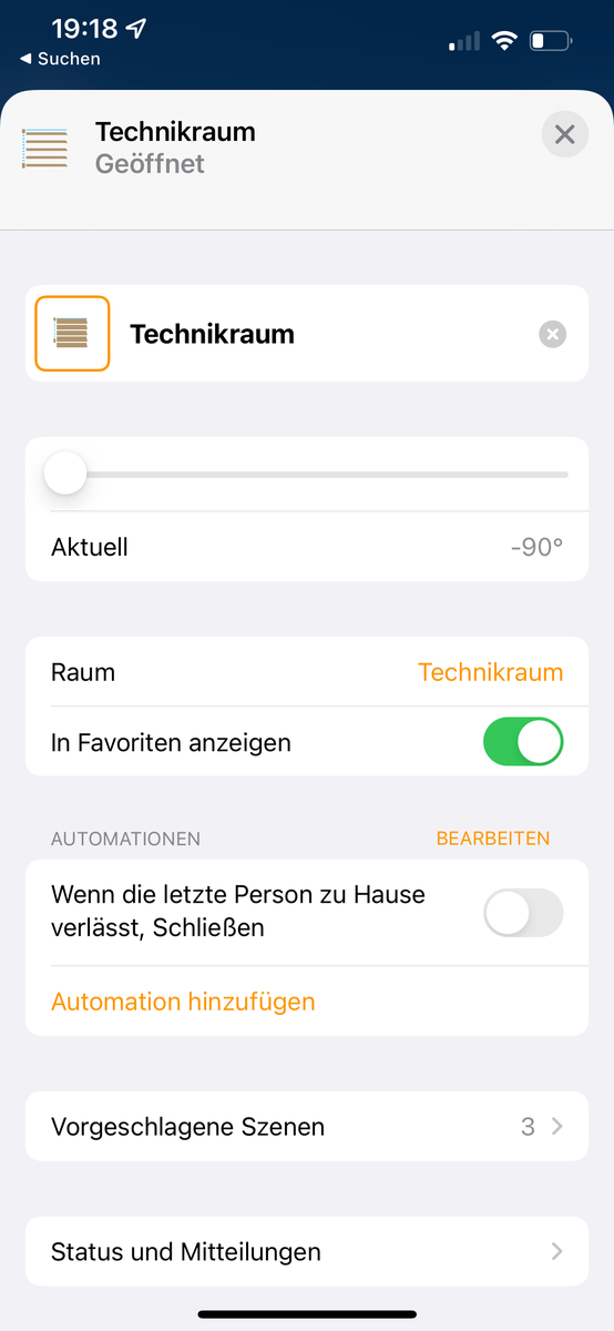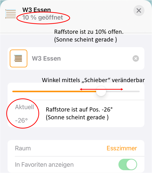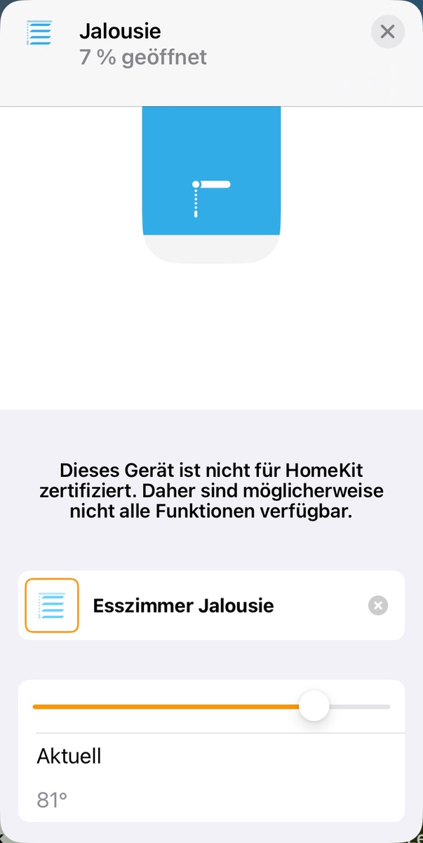 Nur leider habe ich bisher nicht herausfinden können, wie ich die Lamellen der Raffstores per Sprachbefehl neigen kann. Ich kann bisher problemlos öffnen, schließen oder einen gewissen Prozentsatz schließen. Egal wie ich die Befehle aber auch immer formuliere, ich kann die Neigung der Lamellen nicht einstellen.