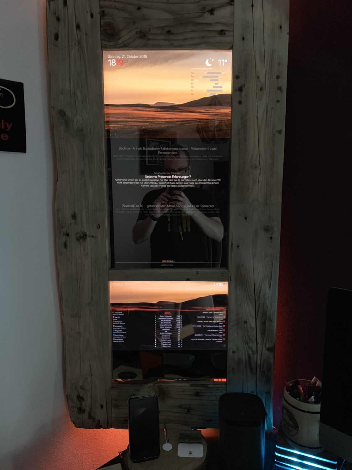 <p>- Bleibt bei euch der Spiegel immer an oder benutzt jemand einen Bewegungssensor oder Ähnliches?</p></woltlab-quote><p>Bei mir sieht das ganze so aus. <br>- Bewegungserkennung habe ich einfach mit MotionSensor und Eve Steckdose, PIR Sensor gibt wohl häufiger Probleme. <br>- die beiden RPI‘s laufen Tag und Nacht<br>- Screens über Nacht aus, schaltbar auch mit Amazon Remote<br>- kein Touch, keine Sprachbefehle<br>- war ne Menge Bastelei<br>- Design über lange Zeit dran geschraubt<br>- der untere Teil zeigt Kalender an und Sensoren von Hue und Lichtstatus an, momentan über Hassio da ich das Hue Modul nicht zum Laufen gebracht habe.</p>