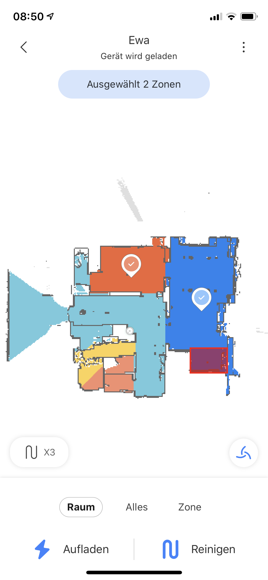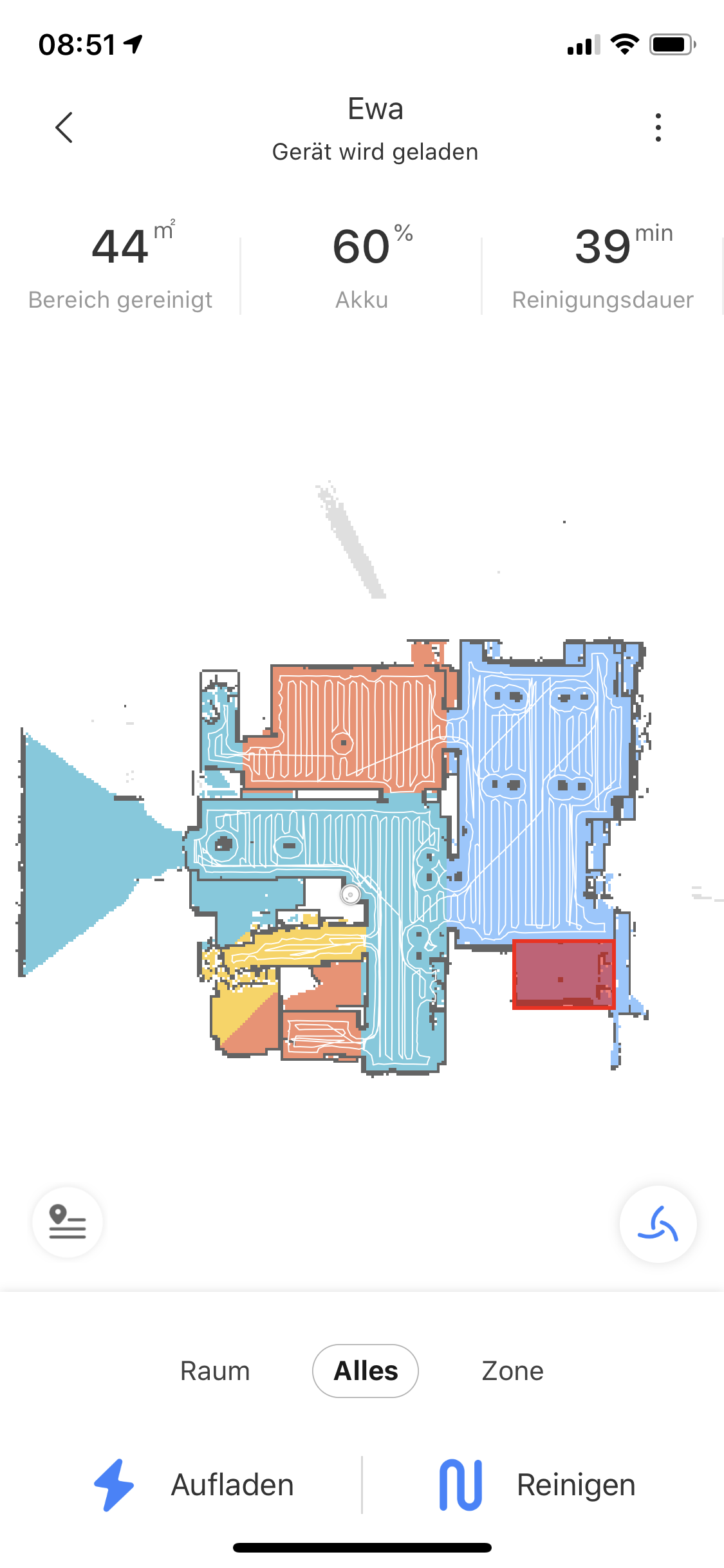 Dann in der Mi App einmal den Cache leeren und den Robo einmal komplett durchfahren lassen, damit er eine neue Karte anlegt. Danach die Räume in der App aufteilen.