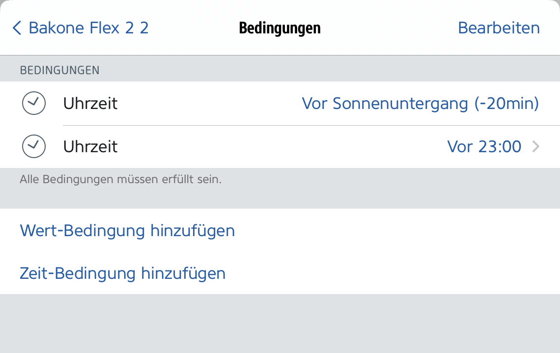 Denke die "Nach Sonnenuntergang + 20 Min" in der Controller App, was in der Eve App zu "Vor Sonnenuntergang minus 20 Min" wird. …….