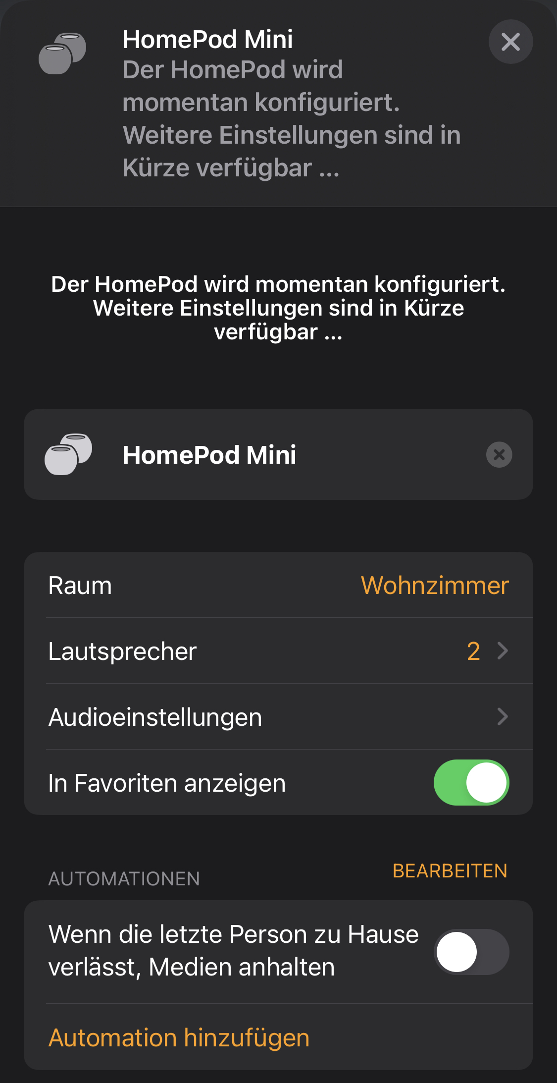 Allerdings habe ich seit mehreren Tagen jetzt die Meldung dass der HomePod Konfiguriert wird.