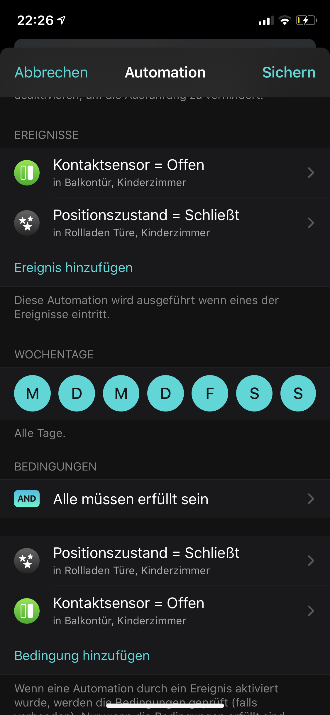 Ich hab die selbe Automation auch schon seit nem Jahr zuverlässig im Einsatz, damit mein Rolladen mich nicht auf den Balkon aussperrt. Allerdings nix mit 99% sondern einfach “positionszustand schließt” als Auslöser genommen, das reagiert sofort. Außerdem noch das öffnen der Balkontür als zweiten Auslöser, falls man doch noch raus will wenn es bereits runtergefahren wird.