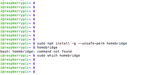 Auch die Schritte danach (also Konfigdatei anlegen und abspeichern mit "mkdir -p ~/.homebridge" und "sudo nano ~/.homebridge/config.json" konnte ich problemlos durchführen. Alles was scheinbar fehlt ist homebridge. Aber scheinbar wird es mit dem Befehl "sudo npm install -g --unsafe-perm homebridge" nicht geladen bzw. nicht installiert.