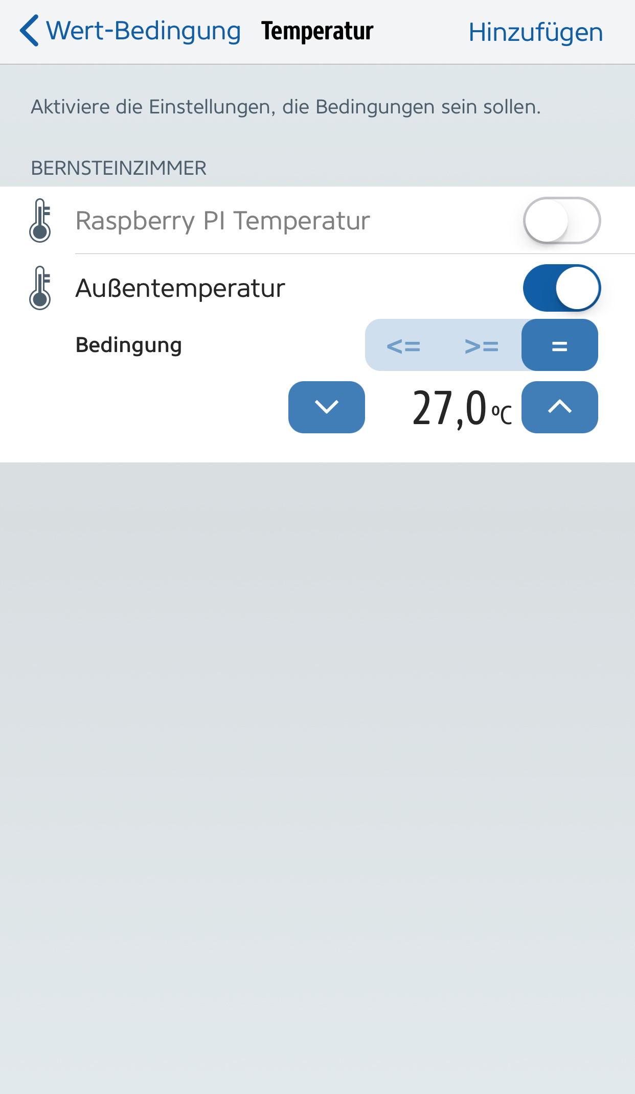 Hallo zusammen. Ich möchte mit der Eve App eine Regel erstellen. Als Auslöser soll eine Temperatur dienen. Aber es gibt nur den Wert =. Nutze ich aber als Bedingung eine Temperatur kann man auch kleiner oder größer auswählen. Warum geht das nur bei der Bedingung und nicht auch beim Auslöser? Nun muss ich mir für den Auslöser ein Dummyschalter setzen, der dauernd ein ist. Oder mache ich etwas falsch?