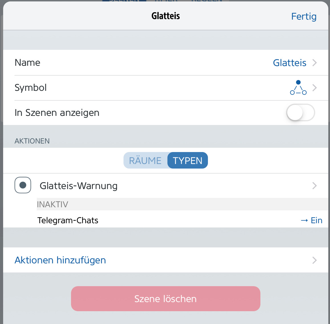 Alles anzeigen{ "platform": "Telegram", "bots": [ { "name": "Telegram-Chats", "token": "XYZ", "chat": "XYZ", "error": "Something broken. I'm shutting down.", "notifications": { "Batterie prüfen": { "messages": [ "Batterie beim Eingangssensor prüfen" ] } } } ] }Doch ich verstehe nicht wie ich dies dan in der Eve App mit den Regeln/Szenen bauen muss. Dachte mir ich bei ich baue eine neue Regel