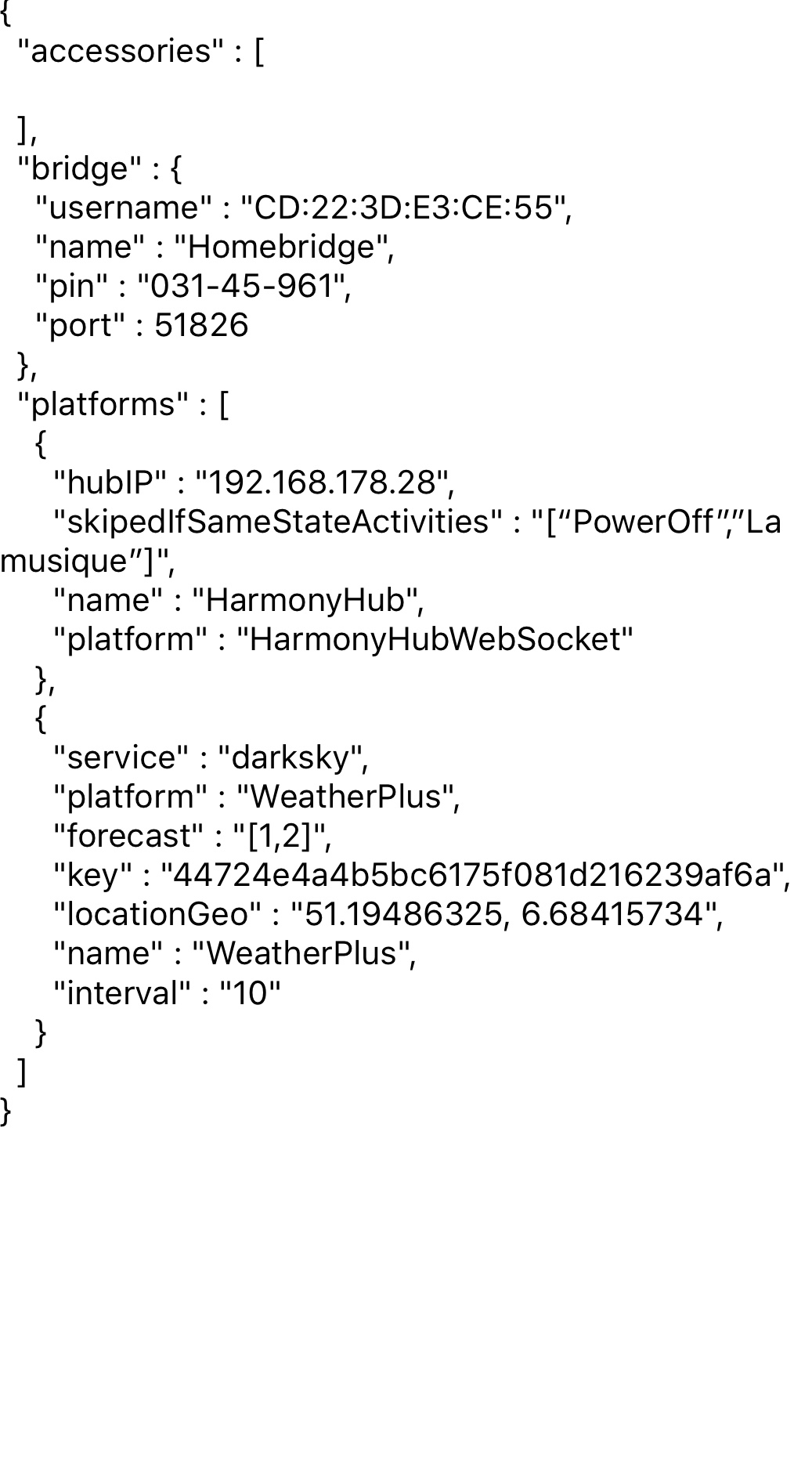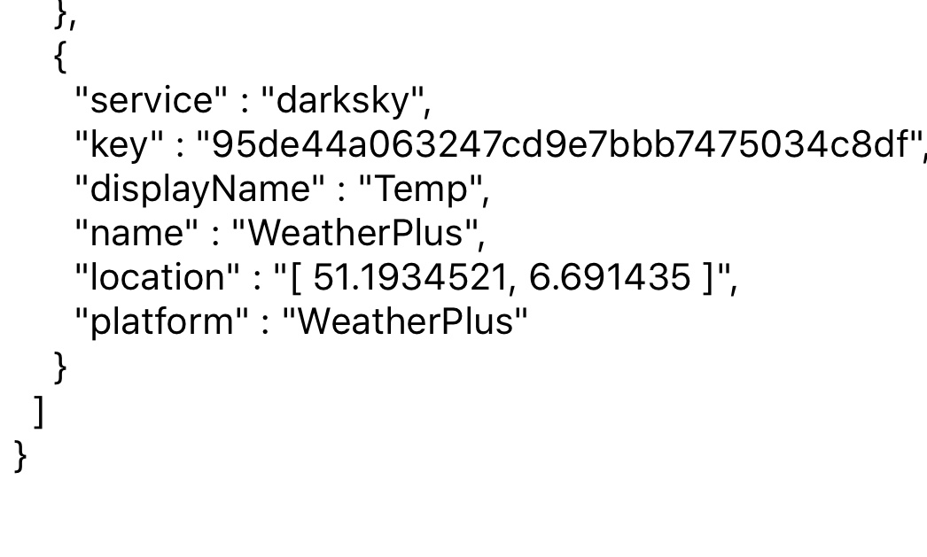 Kann mir vielleicht jemand genau erklären wie ich das Plugin generell zum laufen bekomme. Irgendwie klappt das nicht. Habe alles nach der Anleitung gemacht. Setze ich die geolocation in Klammern werden in der App alle wert auf null gesetzt, lässt man die Klammern weg kommen werte die aber zu meinen Standort eigentlich nicht passen ? wäre toll wenn jemand ne Tipp hat bin relativ frisch und unerfahren was homebridge angeht. ??????