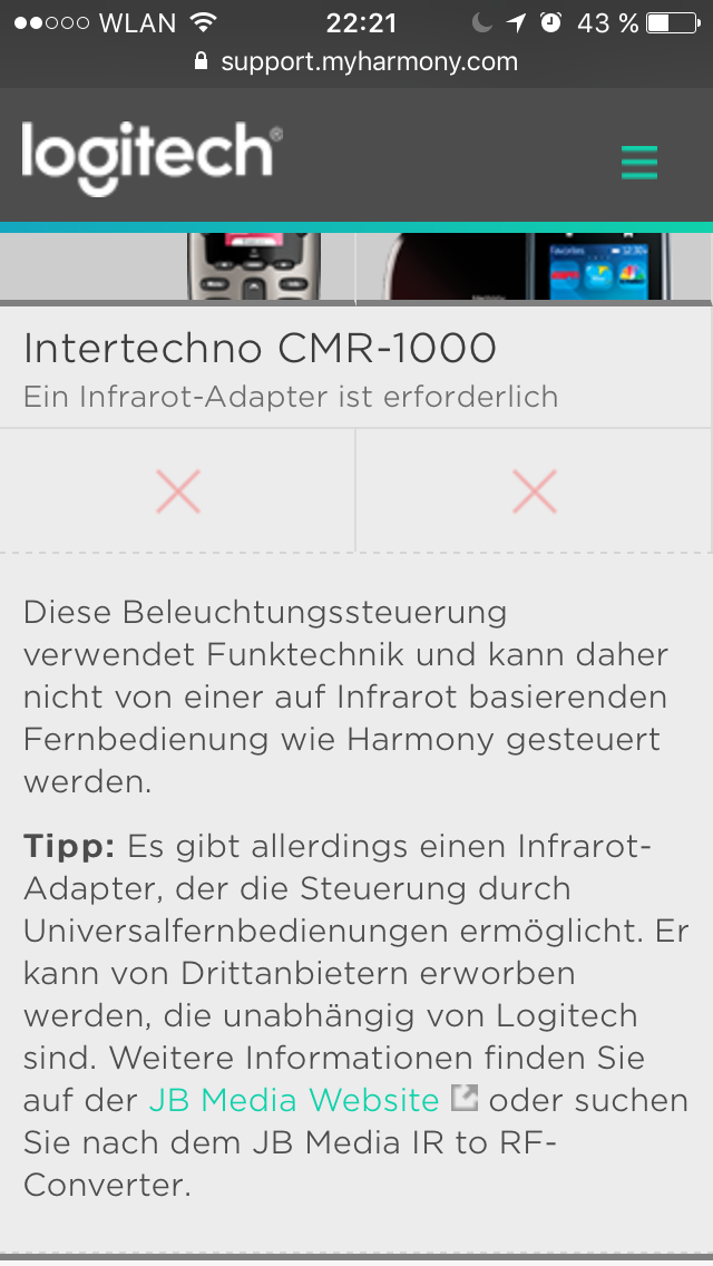 Jetzt war meine erste Überlegung, dass ich diesen Schalter per harmony-hub einbinden kann. Beim Kompatibilitätscheck kommt bei logitech folgender Hinweis: