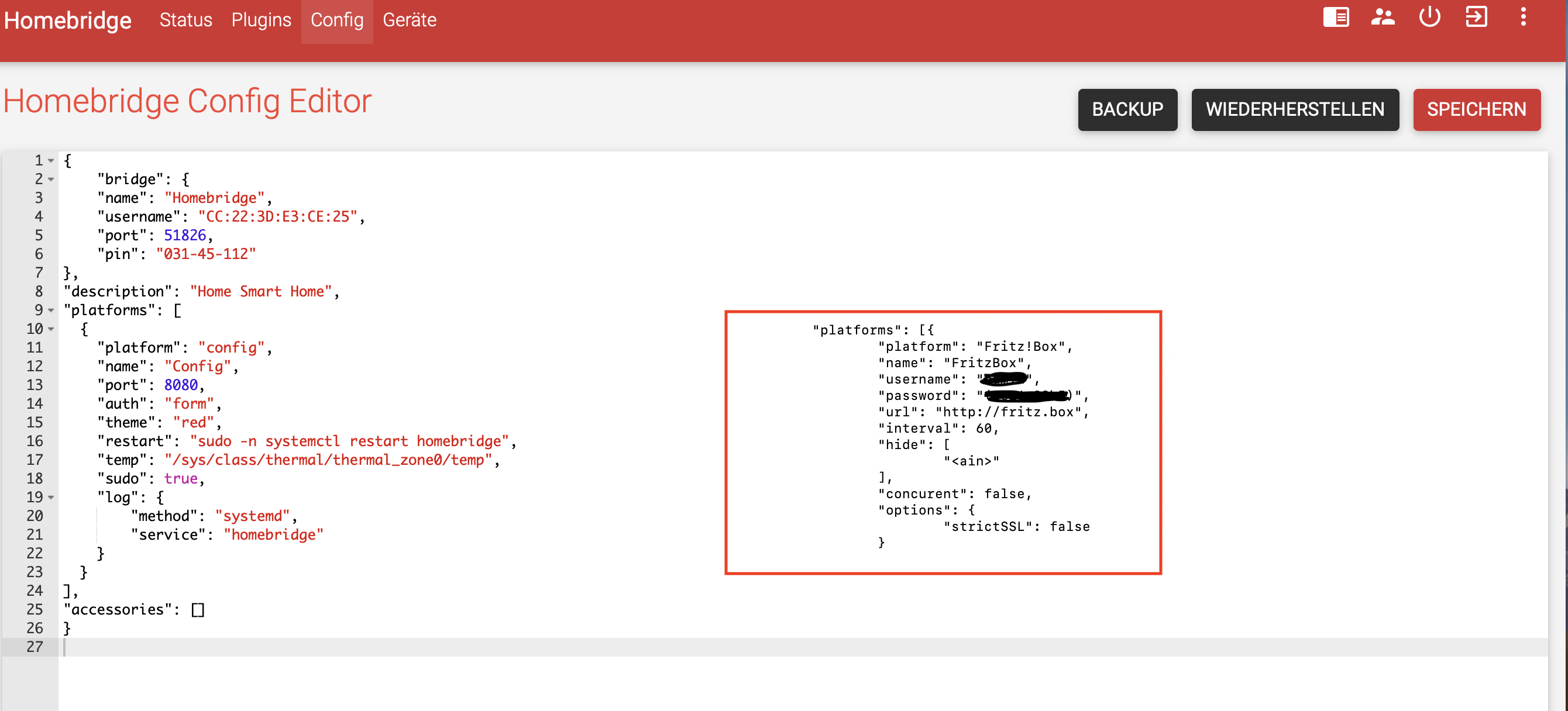 Alles anzeigen{ "bridge": { "name": "Homebridge", "username": "CC:22:3D:E3:CE:30", "port": 51826, "pin": "031-45-154" }, "description": "Home Smart Home", "platforms": [ { "platform": "config", "name": "Config", "port": 8080, "auth": "form", "theme": "red", "restart": "sudo -n systemctl restart homebridge", "temp": "/sys/class/thermal/thermal_zone0/temp", "sudo": true, "log": { "method": "systemd", "service": "homebridge" } }, { "platform": "Fritz!Box", "name": "FritzBox", "username": "admin", "password": "xxxxxx", "url": "http://fritz.box", "interval": 60, "hide": [ "<ain>" ], "concurent": false, "options": { "strictSSL": false } } ], "accessories": [] } -