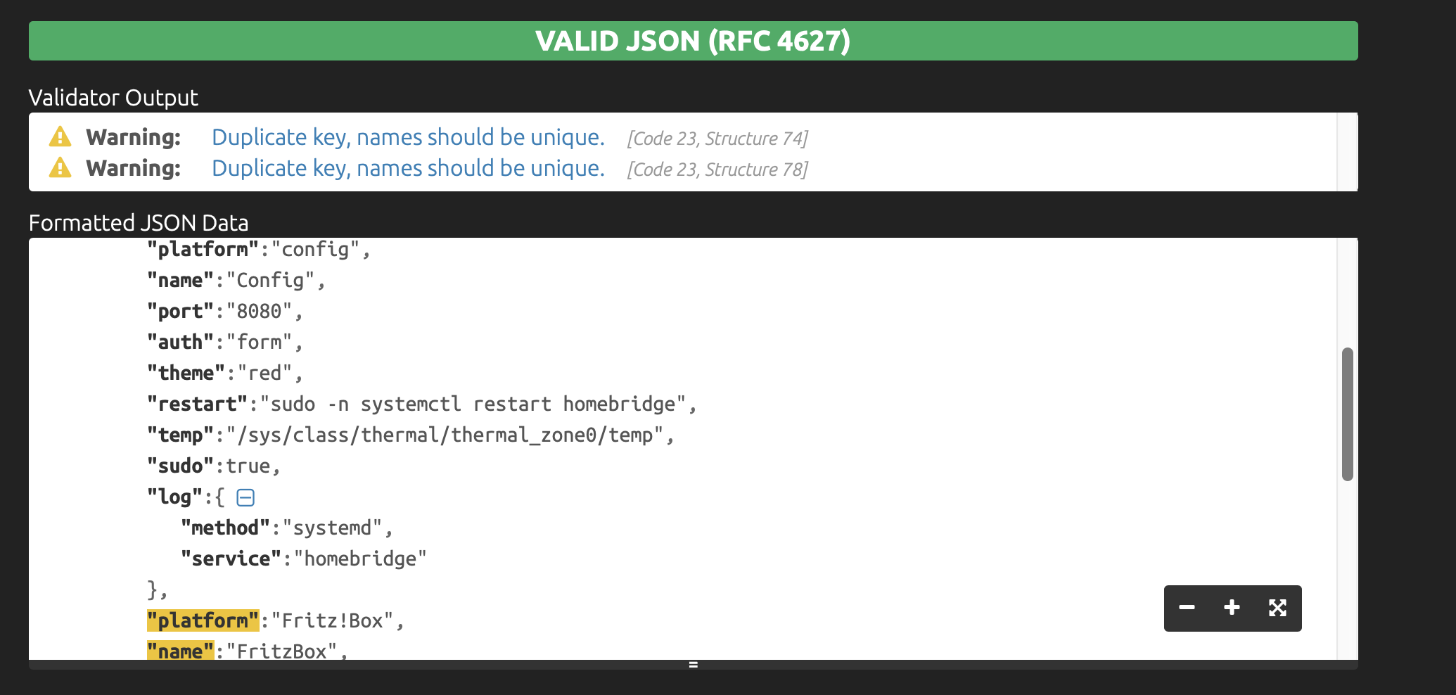 Ich hab die Config auch nochmal in den JSON Formatter / Validator eingegeben. Und bekomme einen Warnhinweis.