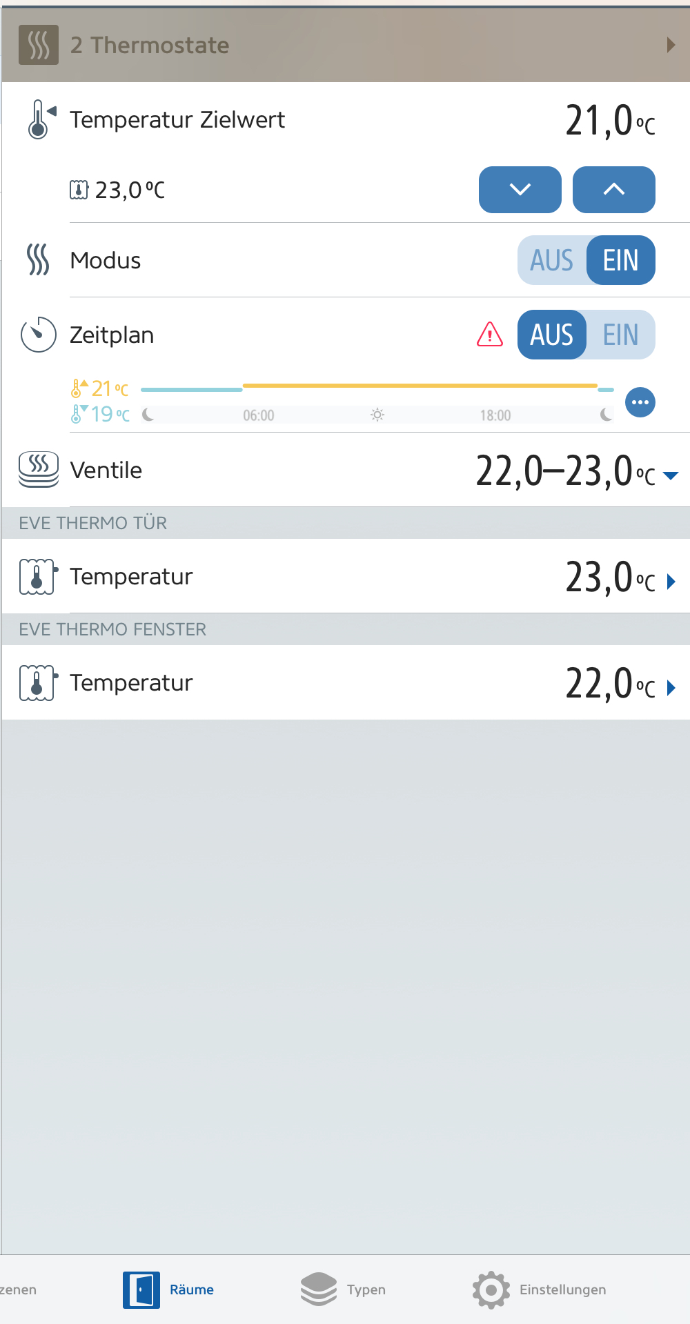 Hallo, ich hab mir jetzt auch die EVE Thermostate zugelegt. Die Einrichtung und Installation ging leicht von Statten, aber nun habe ich ein Verständnisproblem. Trotzdem ich die Zieltemperatur auf 21 Grad eingestellt habe, heizt EVE immer weiter und dreht nicht ab. An was könnte das liegen?