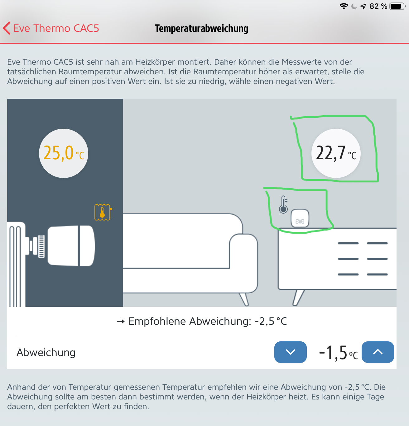 ich bin ganz neu hier und habe auch schon sehr viel zum Thema Eve Thermos gelesen. Ich habe meine jetzt seit 3 Tagen in Betrieb und es funktioniert eigentlich mittlerweile ganz gut. Klar, an den ersten Tagen wurde viel ausprobiert, umkonfiguriert, getestet, usw. Aber eine Frage bleibt bei mir trotzdem noch immer offen. Ich habe schon ziemlich oft gelesen, dass ihr den Offset so auf ca. -1 bis -1,5°C stellt um die 'Hitze', die direkt am Thermostat gemessen wird auszugleichen. Bei mir ist es aber so, dass in meinem Wohnzimmer 3 Geräte installiert habe und diese allesamt einen Offset von +1 bis sogar +3 haben... (1x +1°C, 1x +1,5°C und 1x +3°C). Es ist auch immer so, dass die Ventile geringere Temperatur anzeigen, als mein Thermometer im Wohnzimmer und mit dieser Einstellung jetzt haut es in etwa hin, dass wenn ich 22Grad für die Gruppe Wohnzimmer einstelle, ich auch auf 22Grad komme und die Ventileinstellung in Richtung 5-10% geht.