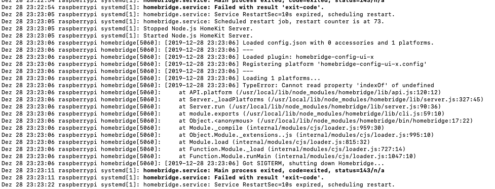 Die Homebridge startet und die Programmroutine wird irgendwo nicht richtig ausgeführt, sodass es endet mit "Failed with result Exit-code´.