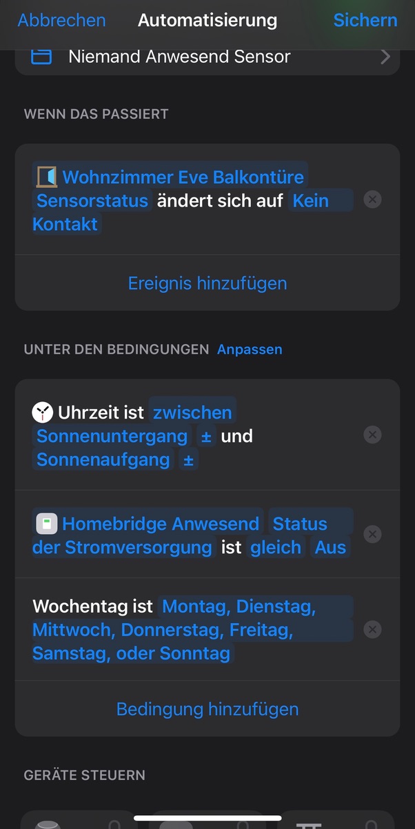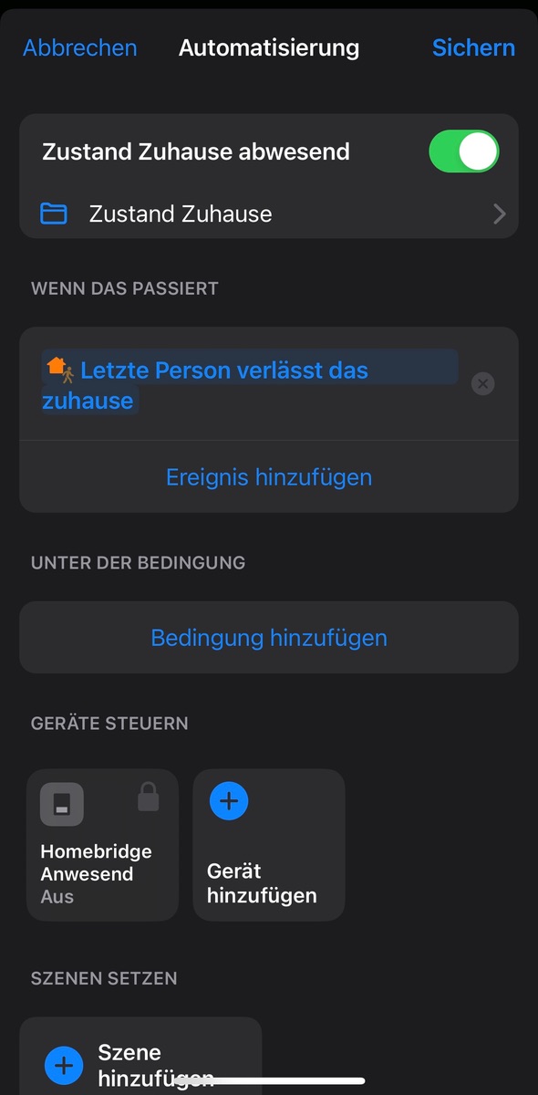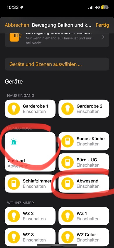 Meine Frage dazu wäre jetzt noch, das ich es von Zuhause aus oder von Unterwges übersteuern kann, muss ich bei jeder Automation den Schalter Anwesned, Zuhause in die Automation Einpflegen ( Siehe Foto!).